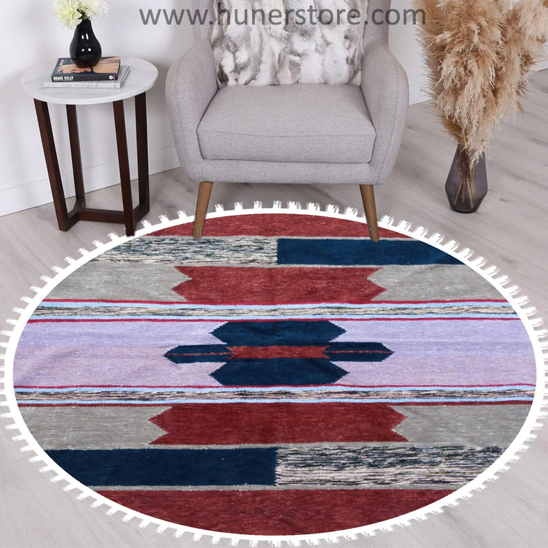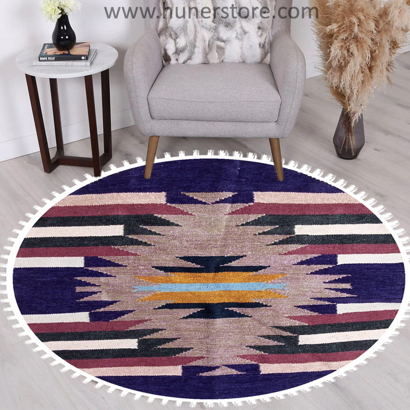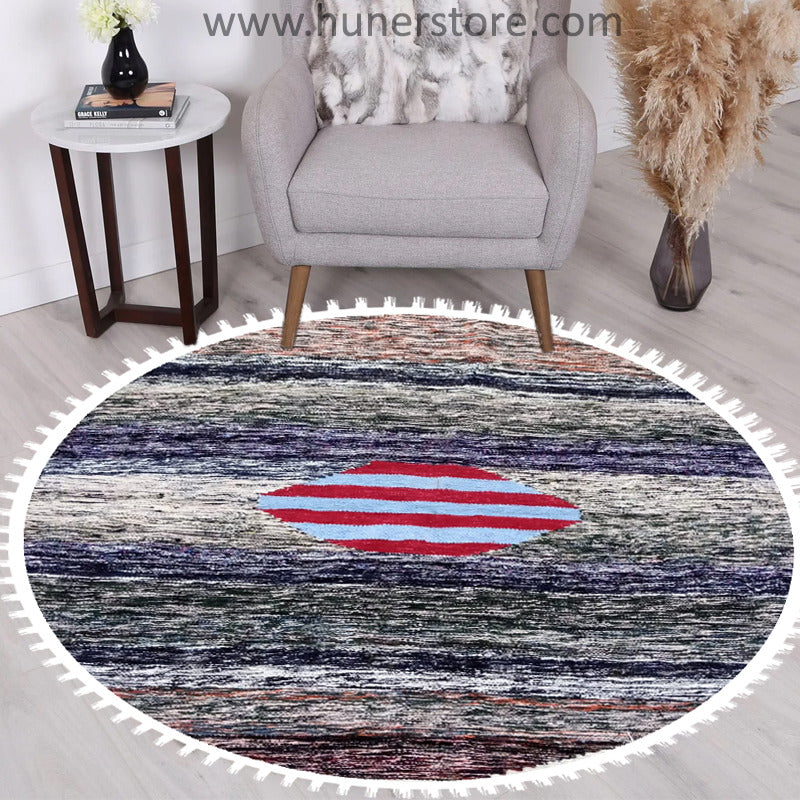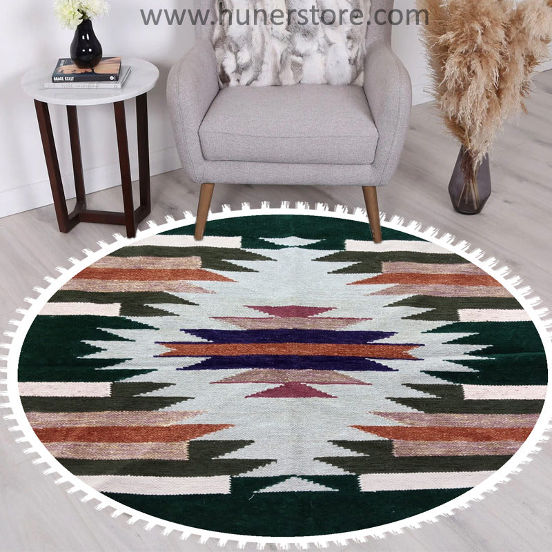 Features: Woolen Hand woven rug multi stripes round shape by the skilled handicrafts men of Pakistan. The rugs are made of wool, which makes them naturally soil-repellent and hard-wearing. Ideal in your living room or under your dining table since the flat-woven surface makes it easy to be a perfect companion for all types of flooring.