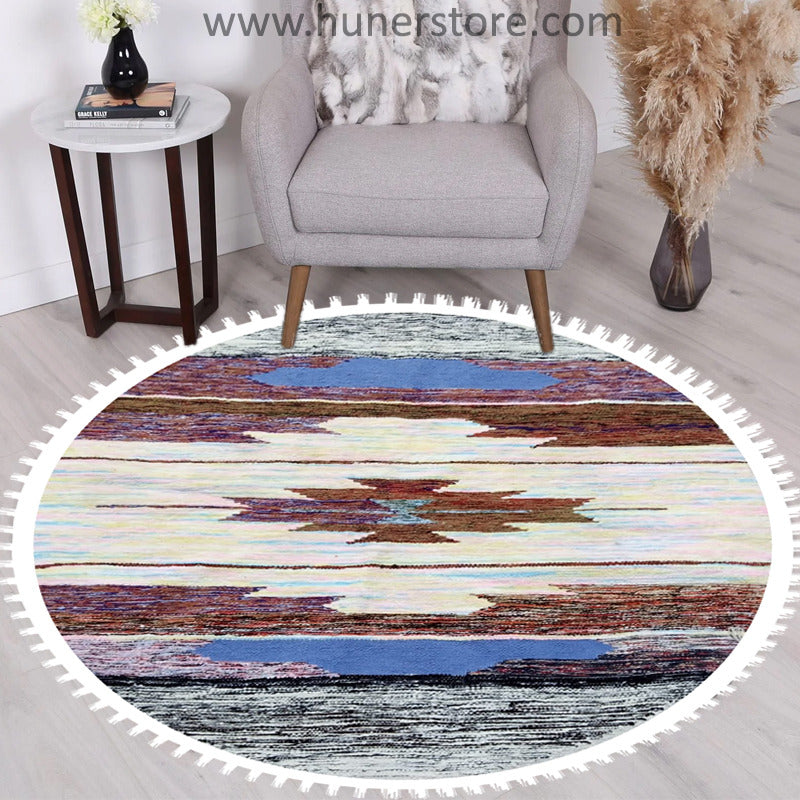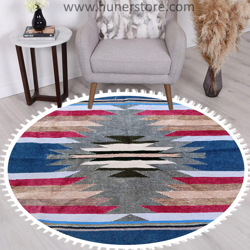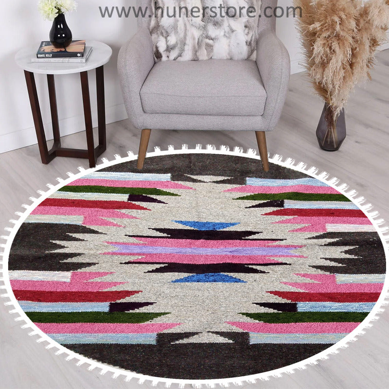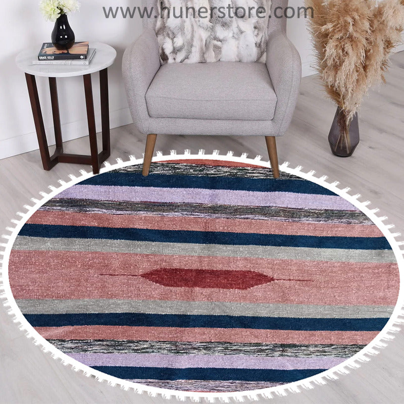 Features: Woolen Hand woven rug multi stripes round shape by the skilled handicrafts men of Pakistan. The rugs are made of wool, which makes them naturally soil-repellent and hard-wearing. Ideal in your living room or under your dining table since the flat-woven surface makes it easy to be a perfect companion for all types of flooring.