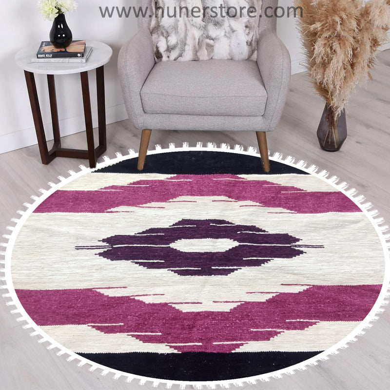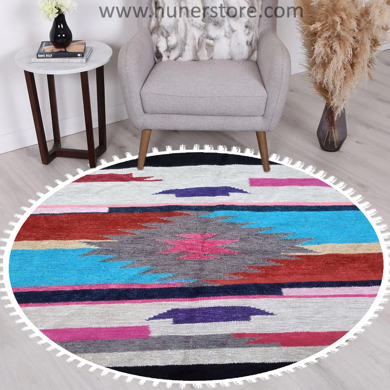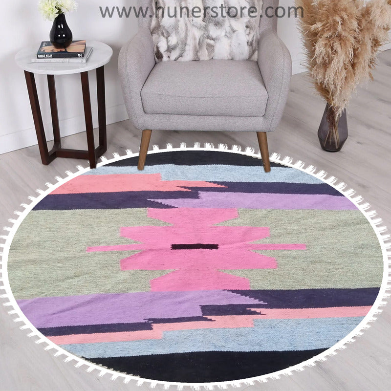 Features:  Woolen Hand woven rug multi stripes round shape by the skilled handicrafts men of Pakistan. The rugs are made of wool, which makes them naturally soil-repellent and hard-wearing. Ideal in your living room or under your dining table since the flat-woven surface makes it easy to be a perfect companion for all types of flooring.