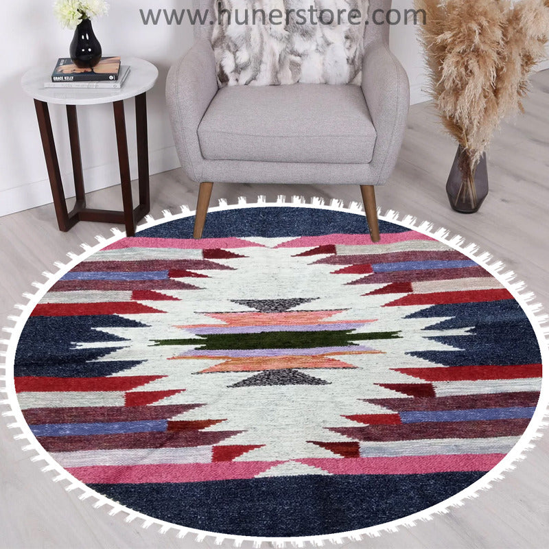Features: Woolen Hand woven rug multi stripes round shape by the skilled handicrafts men of Pakistan. The rugs are made of wool, which makes them naturally soil-repellent and hard-wearing. Ideal in your living room or under your dining table since the flat-woven surface makes it easy to be a perfect companion for all types of flooring.