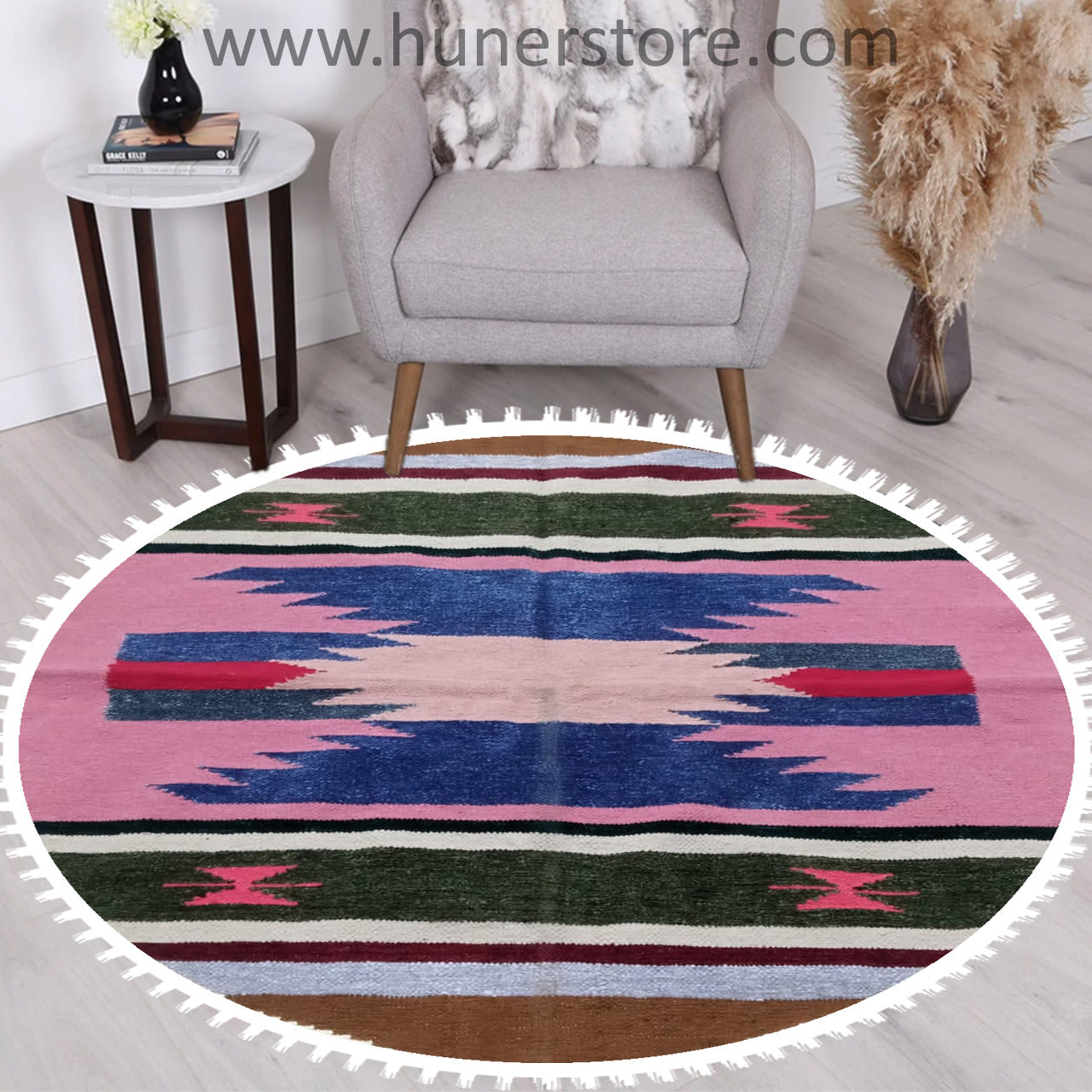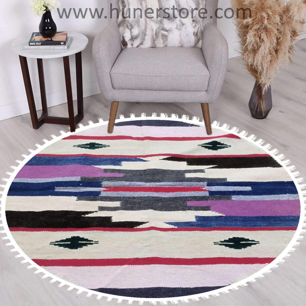Features: Woolen Hand woven rug multi stripes round shape by the skilled handicrafts men of Pakistan. The rugs are made of wool, which makes them naturally soil-repellent and hard-wearing. Ideal in your living room or under your dining table since the flat-woven surface makes it easy to be a perfect companion for all types of flooring.