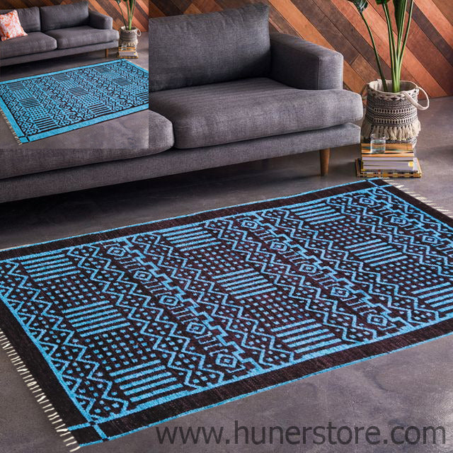 Greek textured hand-woven Woolen Rug by the skilled handicrafts men of Pakistan. The rug is made of wool, which makes it naturally soil-repellent and hard-wearing. Ideal in your living room or under your dining table since the flat-woven surface makes it easy to be a perfect companion for all types of flooring.