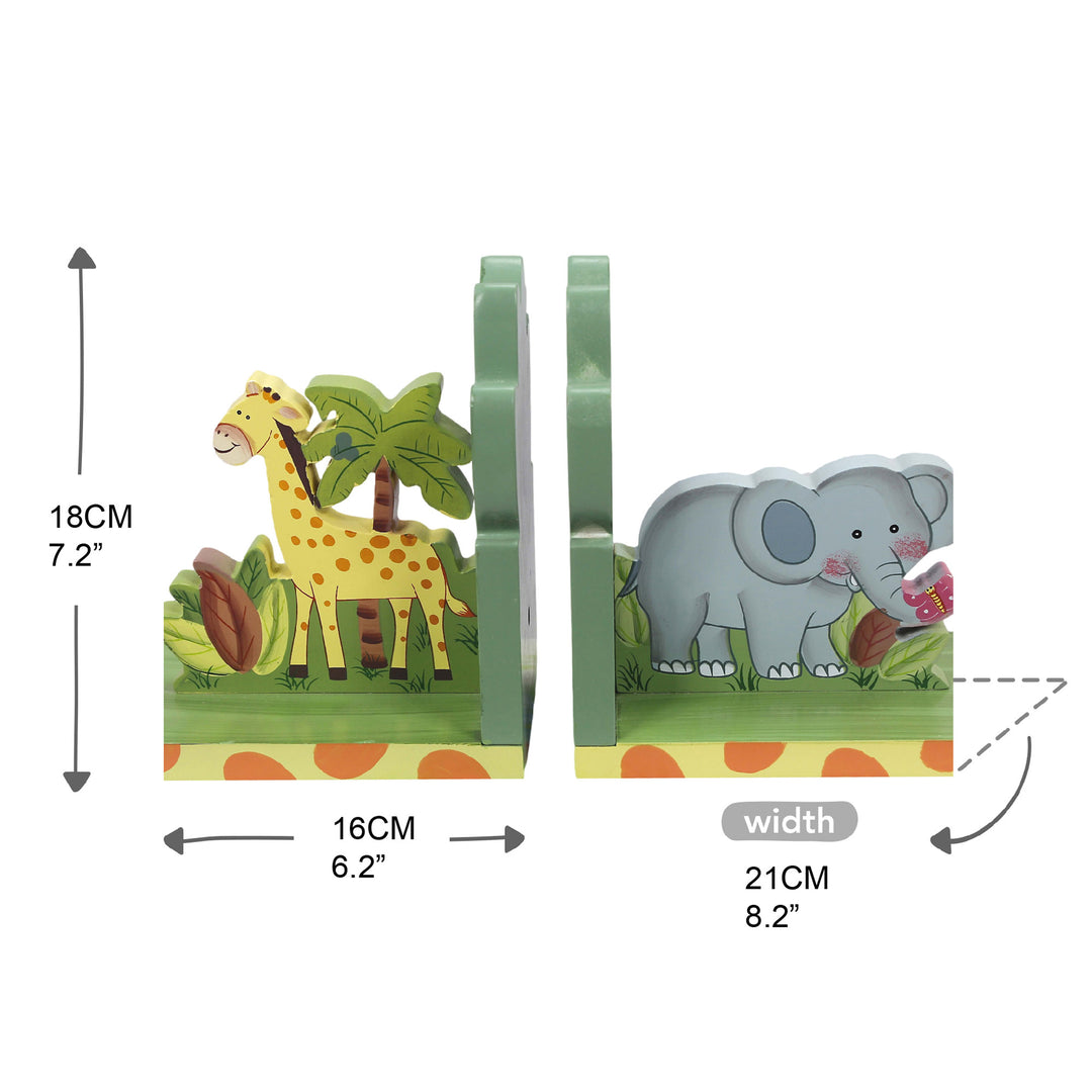 - Bring a touch of wonder to your child's bedroom while organizing their books with the Fantasy Fields Kids Sunny Safari Bookends. These adorable and intricately-painted bookends feature a friendly elephant and giraffe to make playroom organization more fun. Decorated with animal prints, plants, and a multicolor design, these bookends make your little one's bedroom or play area more adventurous.