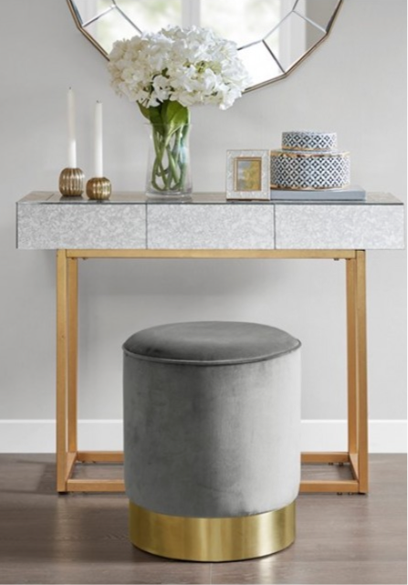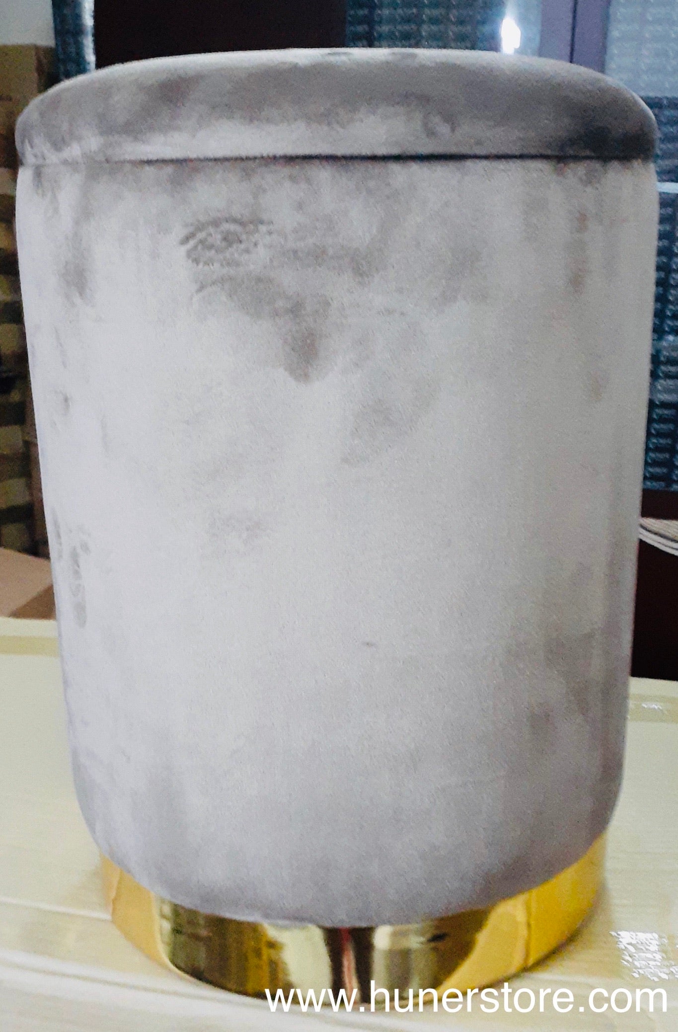 Handcrafted things never go out of style. A skillful masterpiece of art and tradition, this item are all hand-crafted by our locals who have been perfecting their skill for the past decades! Grey round Velvet ottoman with stainless steel gold base.