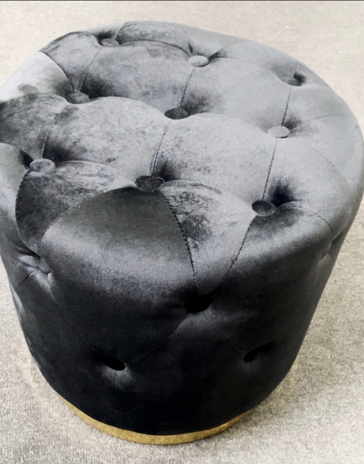 Handcrafted things never go out of style. A skillful masterpiece of art and tradition, this item are all hand-crafted by our locals who have been perfecting their skill for the past decades! Black round Velvet tufted ottoman with stainless steel gold base.