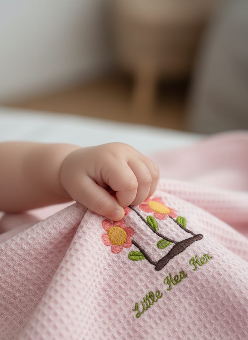 Wrap your little one in warmth, comfort, and charm with our Mama's Boy Baby Waffle Blanket. Crafted from ultra-soft, waffle-textured fabric in a calming beige tone, this cozy blanket features a playful embroidered dinosaur that brings joy to both babies and parents.