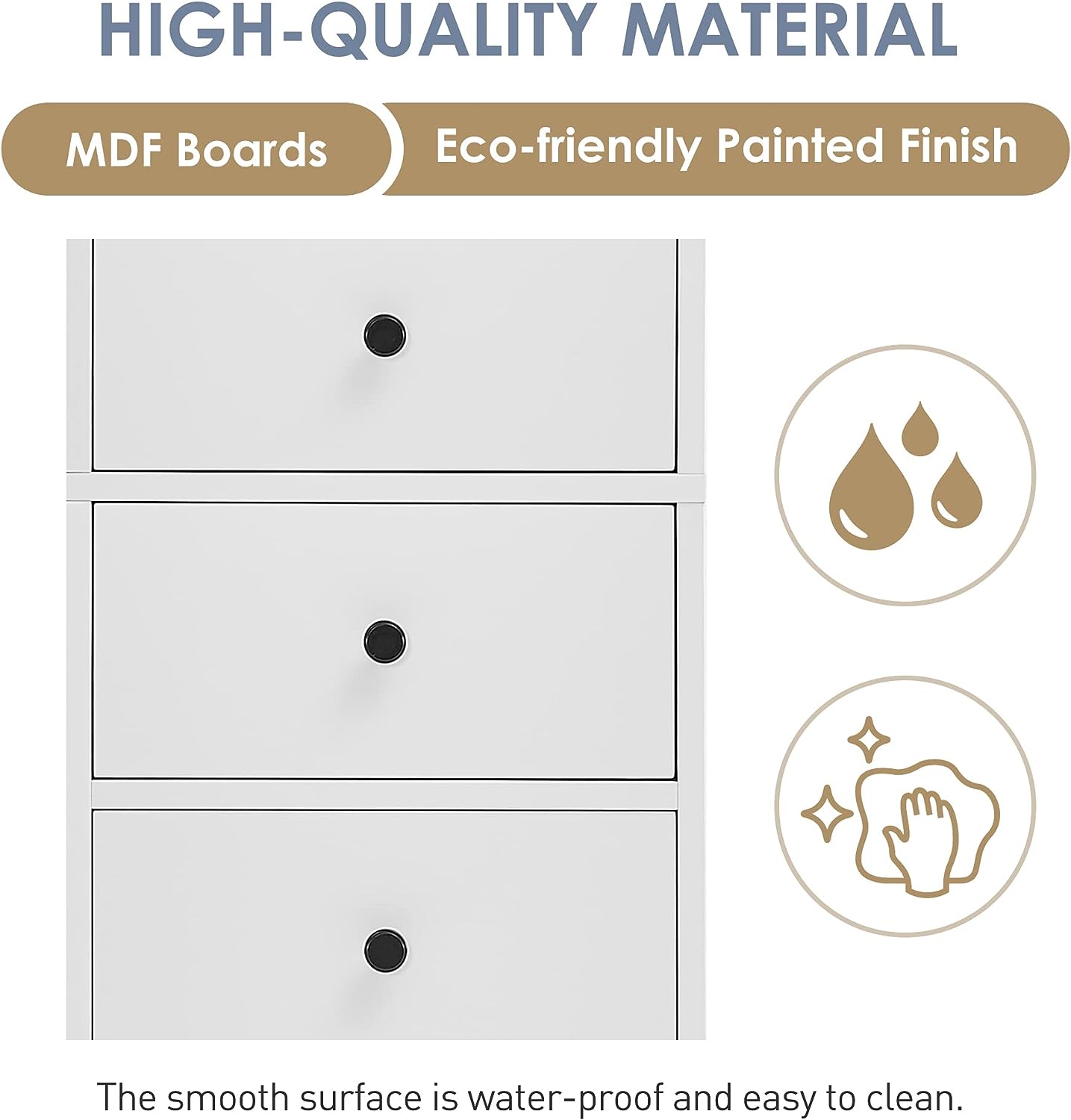 - Open storage shelves, three big drawers and one enclosed cabinet below allow customers to put many different kinds of daily essentials to keep the room clean and tidy. In order to improve using experience, the drawers are equipped with slides.