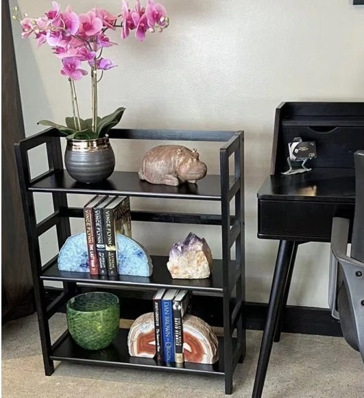 - Three tiers of shelf space are ideal for displaying a collection of books, organizational baskets, and accent pieces.