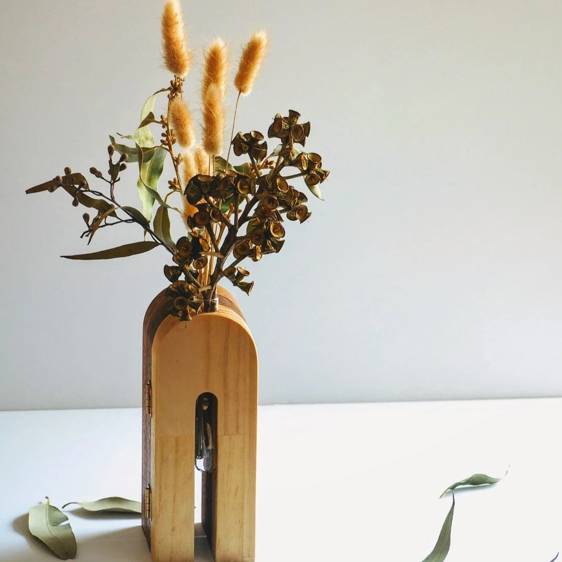 - This piece was handcrafted from a reclaimed Australian pine timer and comes with 3 glass test tubes so you can display either fresh or dry flowers and even propagate your favorite plants!