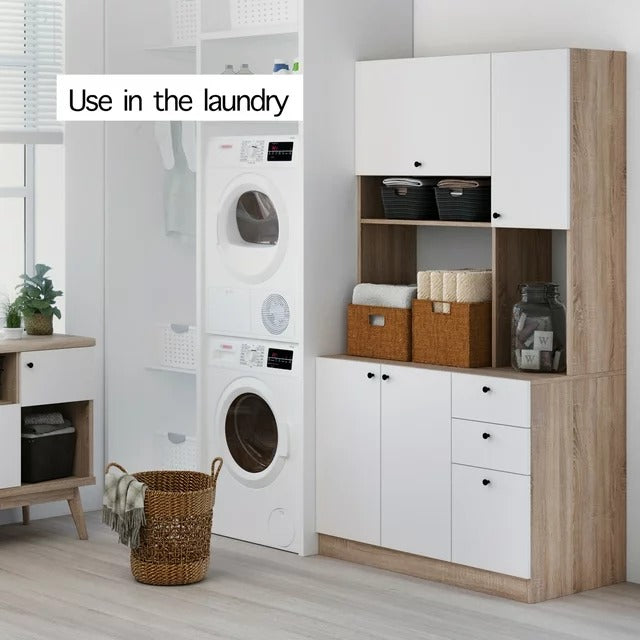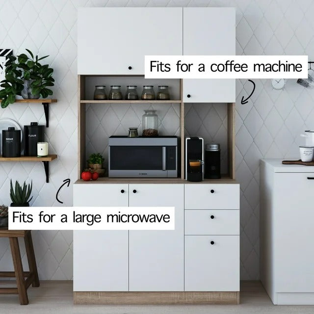 - Whether you’re looking for a microwave cart, or you’re looking for a way to store all of your kitchen essentials, including pots, pans, cutlery, glasses, and even food, our large kitchen storage cabinet is the perfect solution!