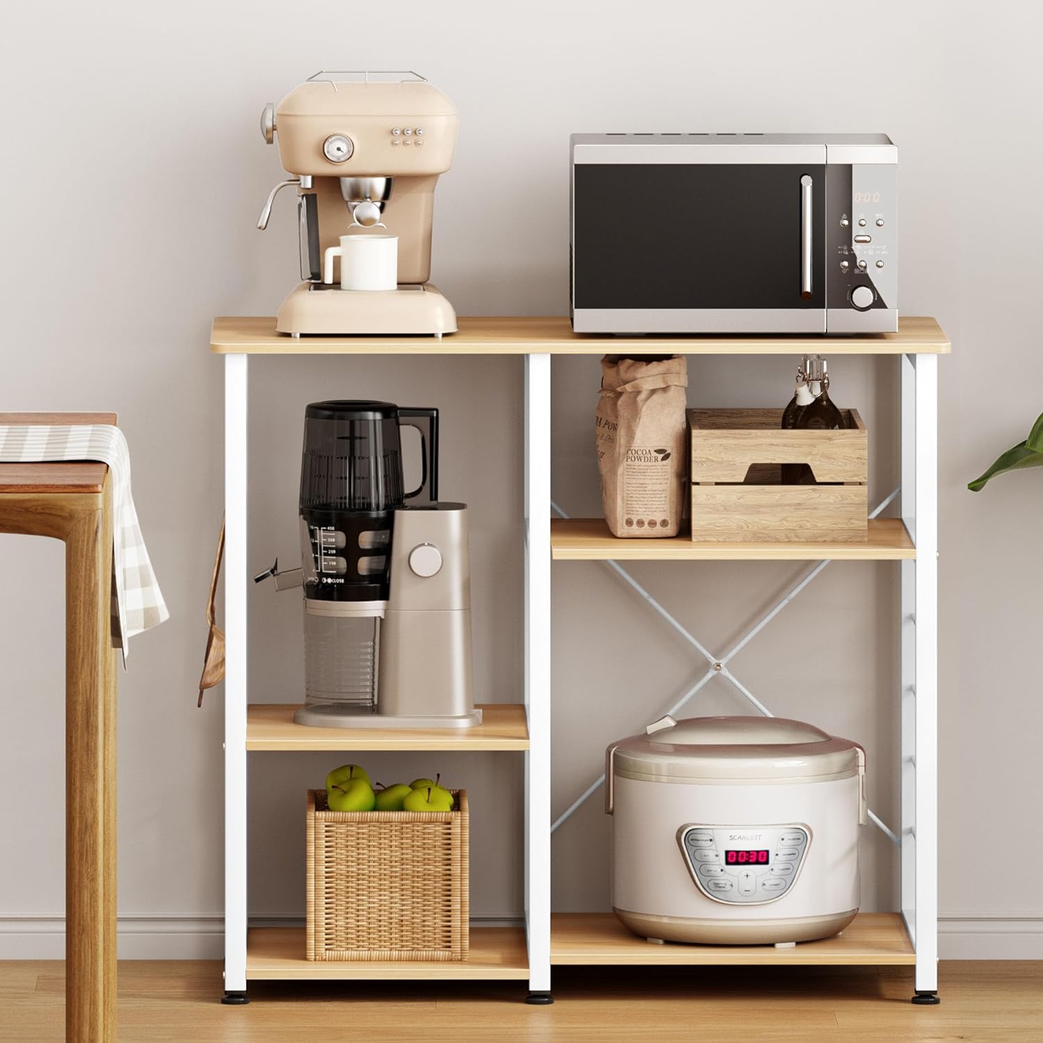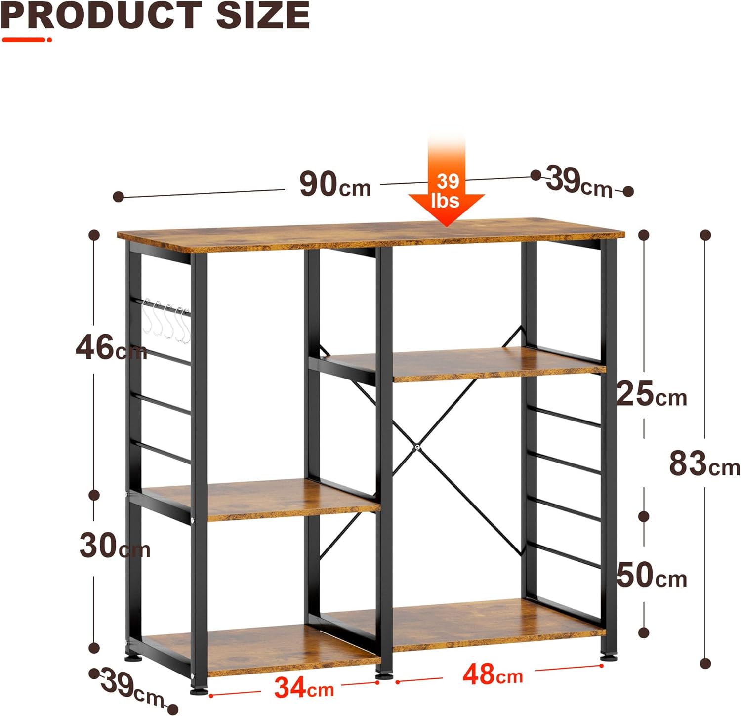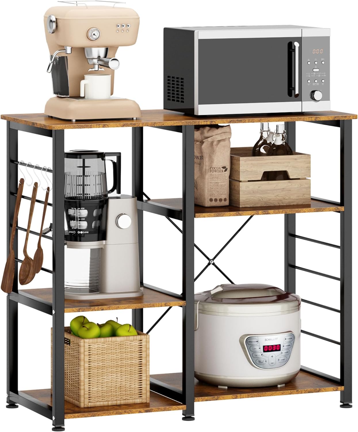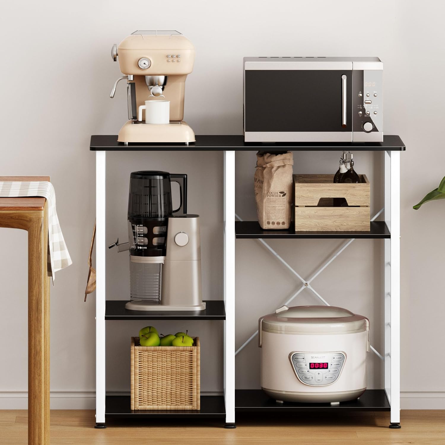 - You can place a microwave or other kitchen appliances on the sturdy top shelf, and store toasters, spices, dishes, and other items on the remaining shelves and basket.