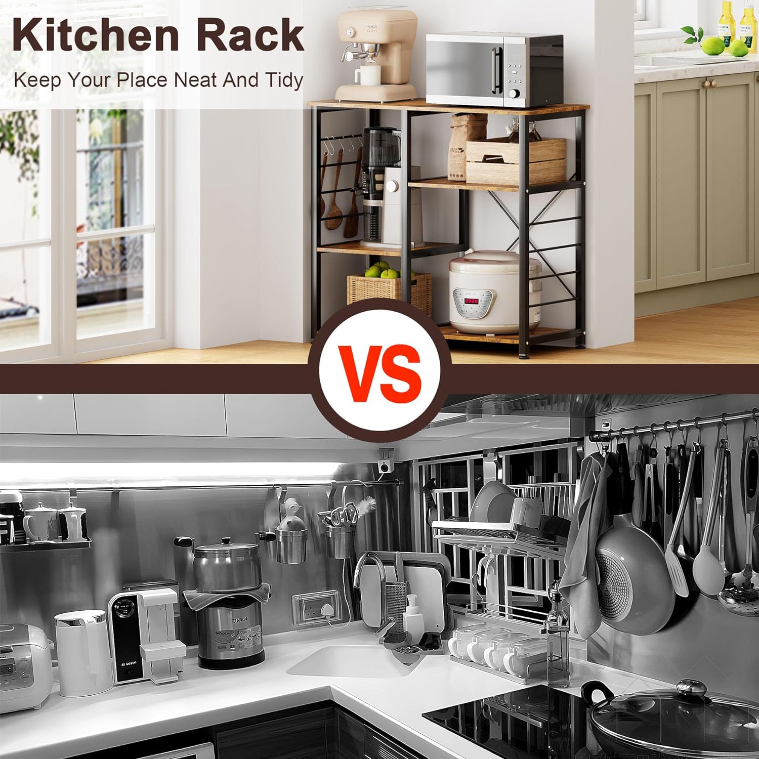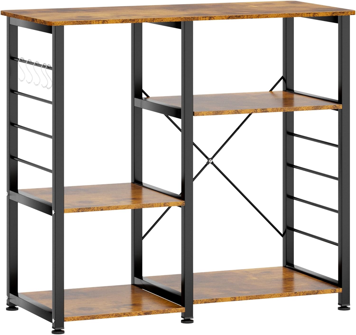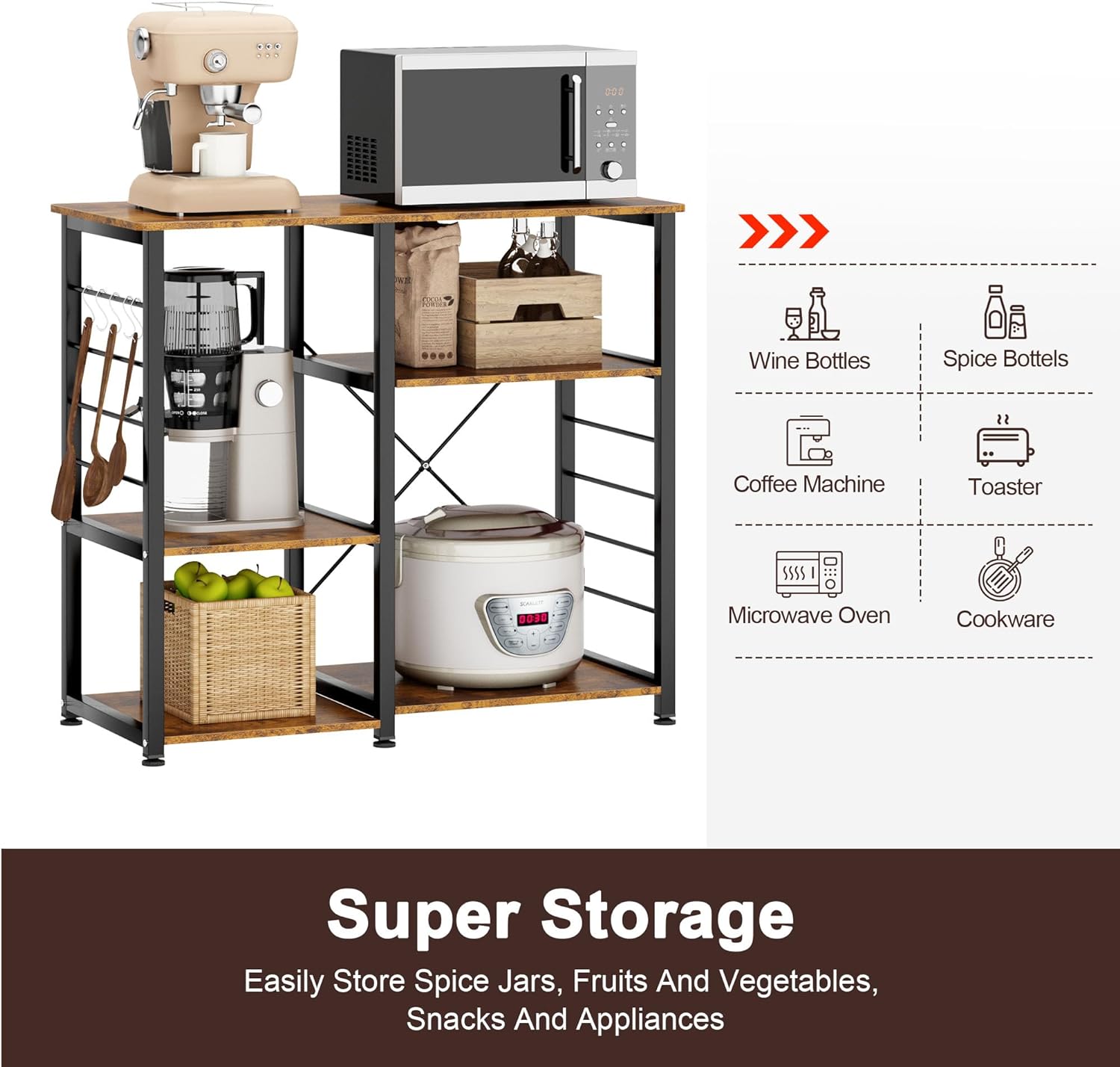 - The kitchen baker's rack is a practical storage workstation with five tier shelves and one pull-out wire basket.