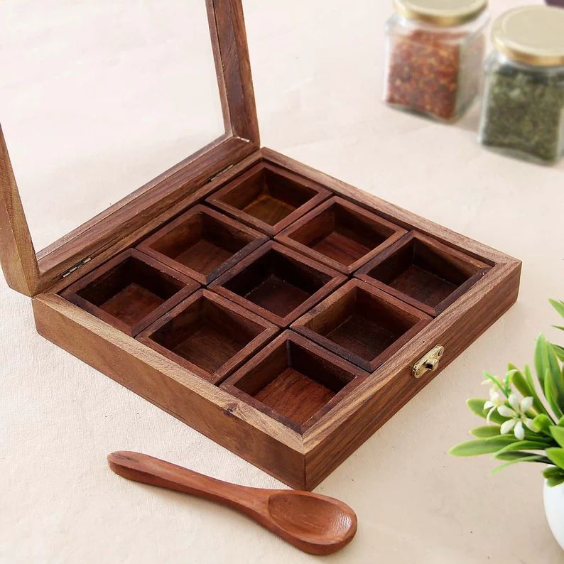 Elevate your kitchen organization with this beautifully handcrafted wooden spice box. Designed with nine spacious compartments, it’s perfect for storing various spices, herbs, and condiments, keeping them neatly arranged and easily accessible.
