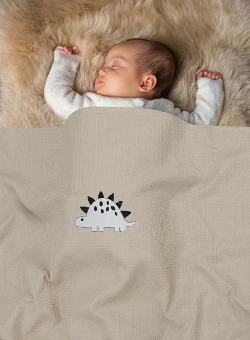 Wrap your little one in warmth, comfort, and charm with our Snuggle Dino Baby Blanket. Crafted from ultra-soft, waffle-textured fabric in a calming beige tone, this cozy blanket features a playful embroidered dinosaur that brings joy to both babies and parents.